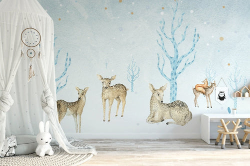 Tapete Babyzimmer blau Wald und Rehe