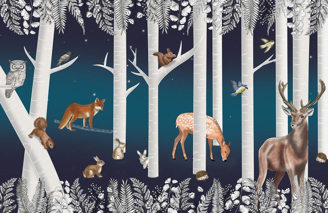 Mit unserer Fototapete Zauberwald und seine Tiere in der Nachtversion ist es, als ob Sie eine Lichtung, einen märchenhaften Wald betreten würden. Auf dieser Panoramatapete sind zahlreiche liebenswerte Tiere wie Eichhörnchen, Rehe, Hasen und Igel abgebildet. So viele Begleiter, um die Nächte Ihres Kindes zu begleiten. Die natürlichen Farben dieser Wandgestaltung ermöglichen es, die Dekoration des Raumes ganz einfach abzustimmen.