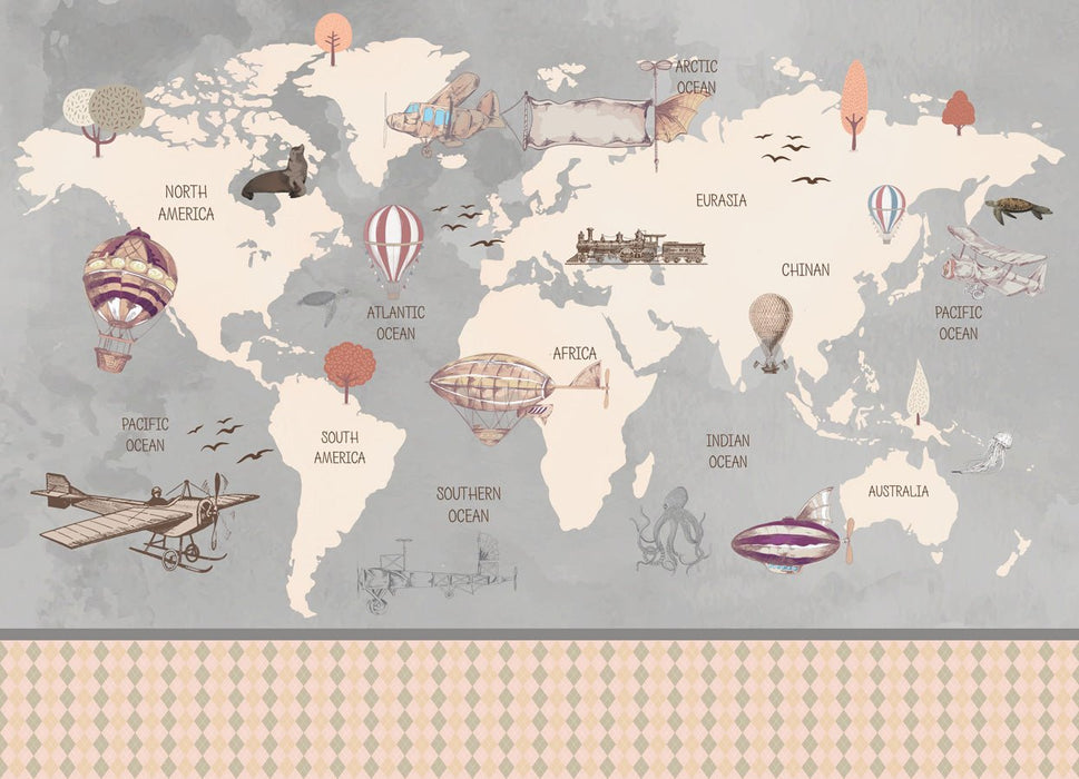 Diese Weltkarten-Tapete Kids ist perfekt, um ein Kinderzimmer spielerisch zu dekorieren. Die Pastellfarben werden einen sanften Stil und eine Atmosphäre zum Entspannen schaffen. Ein tolles visuelles Ensemble, um Kinder zu faszinieren und zu unterhalten. Erstellen Sie ganz einfach eine kindgerechte und verspielte Dekoration mit diesem Wandbild nach Ihren Wünschen! Diese Wanddekoration ist ideal für ein Baby- und Kinderzimmer.