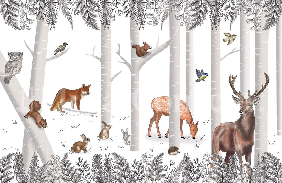 Mit unserer Fototapete Zauberwald und seine Tiere ist es, als würden Sie eine Lichtung, einen märchenhaften Wald betreten. Auf dieser Panoramatapete sind zahlreiche liebenswerte Tiere wie Eichhörnchen, Rehe, Hasen und Igel abgebildet. So viele Begleiter, um die Nächte Ihres Kindes zu begleiten. Die natürlichen Farben dieser Wandgestaltung ermöglichen es, die Dekoration des Raumes ganz einfach abzustimmen.