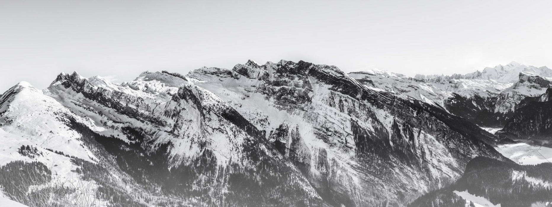 Die schwarz-weiße Bergtapete Grand Massif ist die ideale Kulisse, um Ihr Zuhause zu schmücken. Diese schwarz-weiße Panorama-Tapete ist inspirierend und exotisch zugleich und bietet einen außergewöhnlichen und kunstvollen Blick auf die berühmtesten Berge der Alpen.