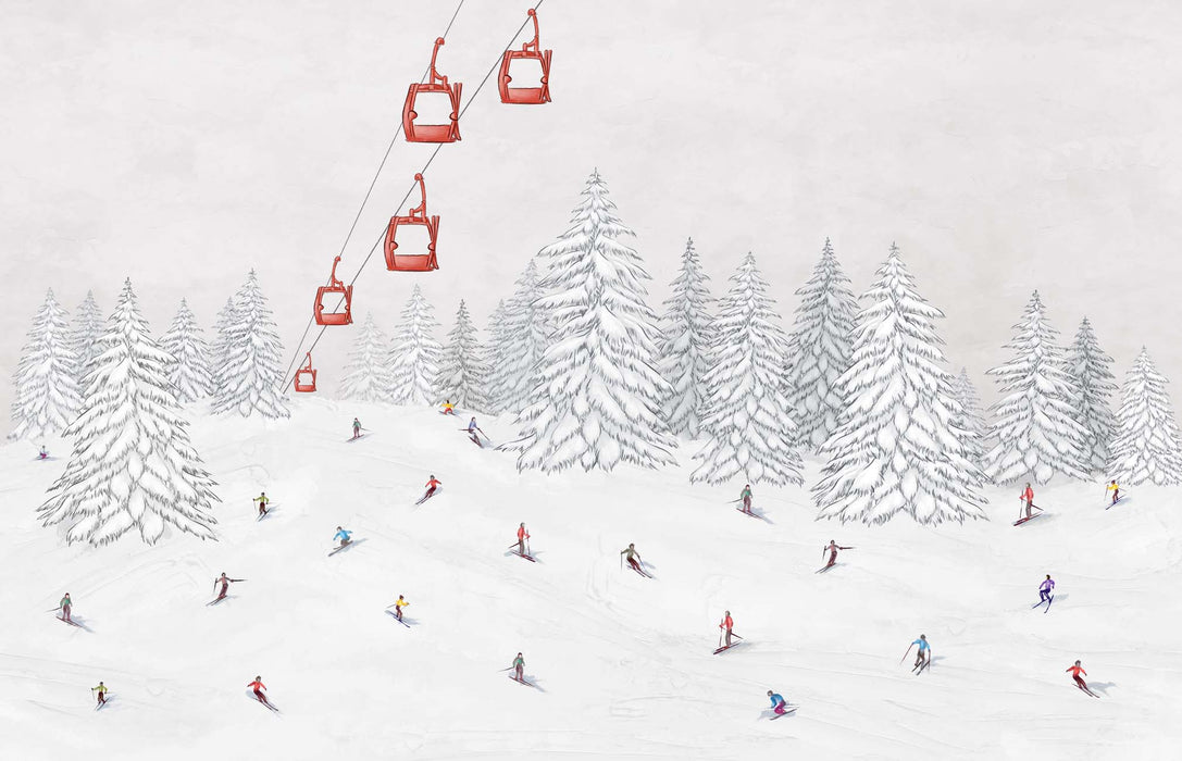 Dieses Wanddesign besteht aus Bergen, Schnee und einem leicht nebligen Himmel, mit Gondeln in peppigen Farben und Skifahrern, wie wir sie lieben.