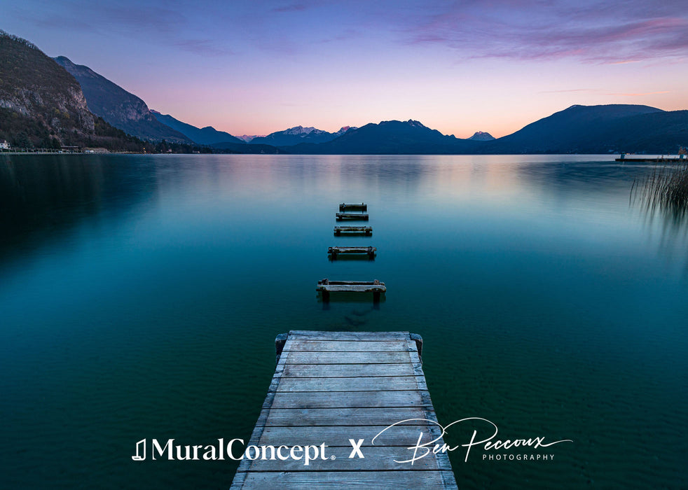 Entdecken Sie unsere wunderschöne Fototapete mit dem geheimen Steg von Annecy, die in Zusammenarbeit mit dem Fotografen @Benpeccoux entstanden ist und Ihrer Inneneinrichtung einen Hauch von Charme und Gelassenheit verleihen wird. Diese Panorama-Tapete inszeniert einen Sonnenaufgang am Ufer des Sees von Annecy in der Haute-Savoie, mit einem Steg, der Sie zu einer Flucht aus dem Alltag einlädt.