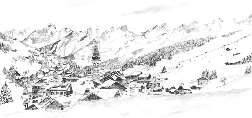 Papier peint panoramique La Clusaz en peinture - Noir et blanc