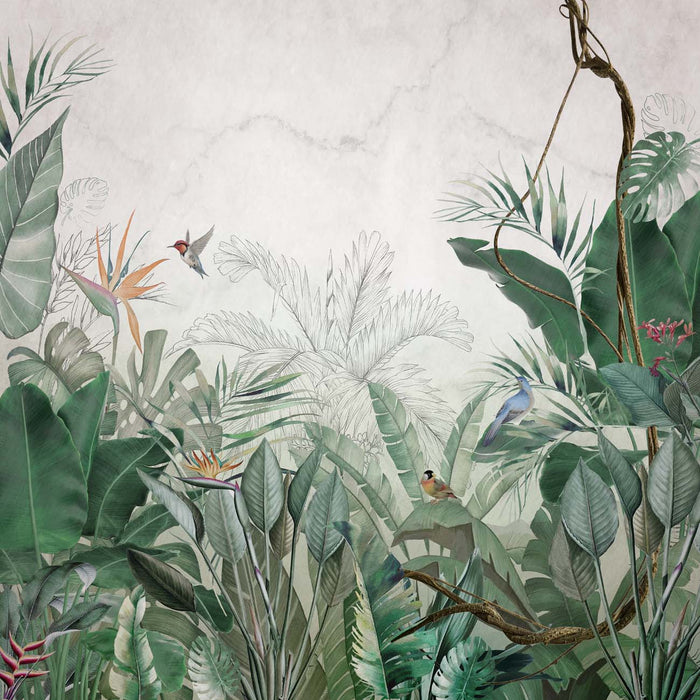 Immerse yourself in nature with our panoramic jungle quintessence green wallpaper. With its lush foliage and vivid green palette, this wallpaper will bring an exotic, relaxing ambience to any room.