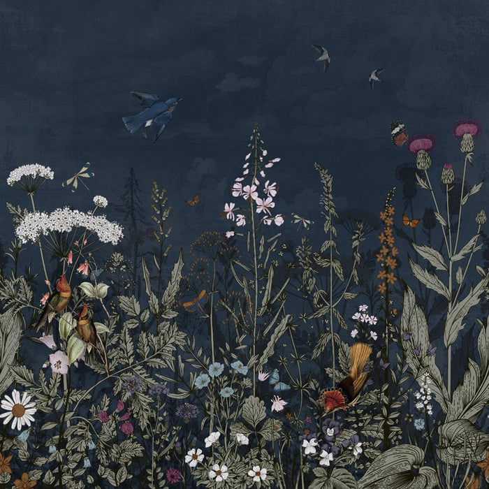 Artistic panoramic wallpaper collection, romantic wallpaper, poetic wallpaper, floral panoramic tapestry. Midnight blue wallpaper, chic panoramic wallpaper. For a wall over 400 cm long, don't hesitate to choose the made-to-measure graphics option for a harmonious finish.