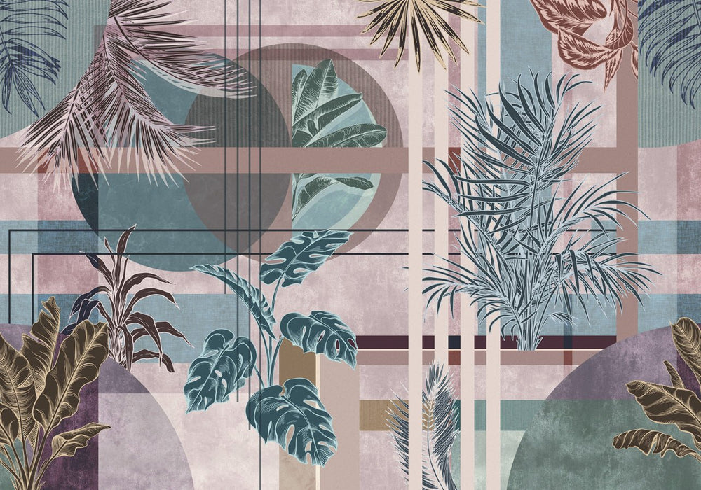 The geometric palms rose wallpaper is a contemporary and modern panoramic wallpaper. This XXL tapestry is perfect for any interior, refreshing the decor with delicacy and subtlety. This geometric wallpaper highlights its shapes and colors, and is emblazoned with plants and leaves to add a touch of greenery to your interior decor! Install this contemporary made-to-measure wallpaper to complete your decor.