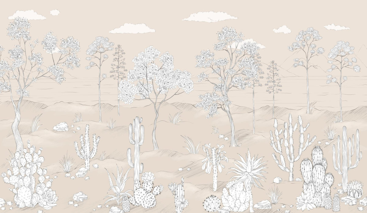 Transform your interior with our tropical cactus oasis wallpaper. Inspired by Mexico, and more particularly the city of Oaxaca, this panoramic wallpaper subtly enhances any decor. This tropical wallpaper is a made-to-measure wallpaper that goes everywhere thanks to its light shades of beige and delicate cactus and vegetation motifs. Dare a new, original and elegant wall decoration with our new panoramic cactus wallpaper.