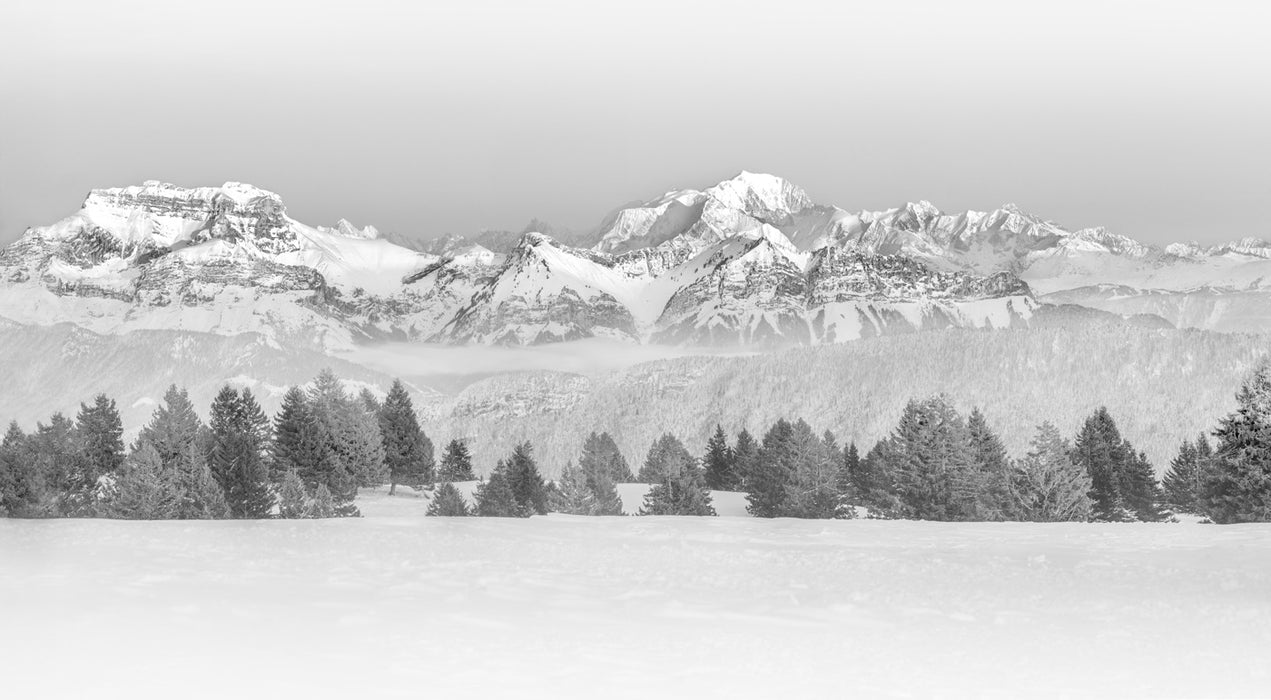 Give your interior a breathtaking view of the Alps with our wallpaper depicting the western slope of the famous "Tournette," a majestic backdrop inspired by the region's legendary peaks. This mountain landscape wallpaper features the imposing silhouette of the Tournette, rising proudly opposite the legendary Mont Blanc.