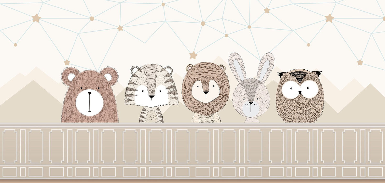 Decorate with safari baby room wallpaper. With its Scandinavian allure, this eco-friendly, panoramic wallpaper will enchant your baby. Childlike animals, soft colors and rounded, enveloping shapes are perfect for learning. Helping to develop your child's imagination has never been easier than with panoramic wallpaper. This made-to-measure wallpaper is antibacterial and resistant. This wallpaper is made without pollutants. Buy baby wallpaper online.