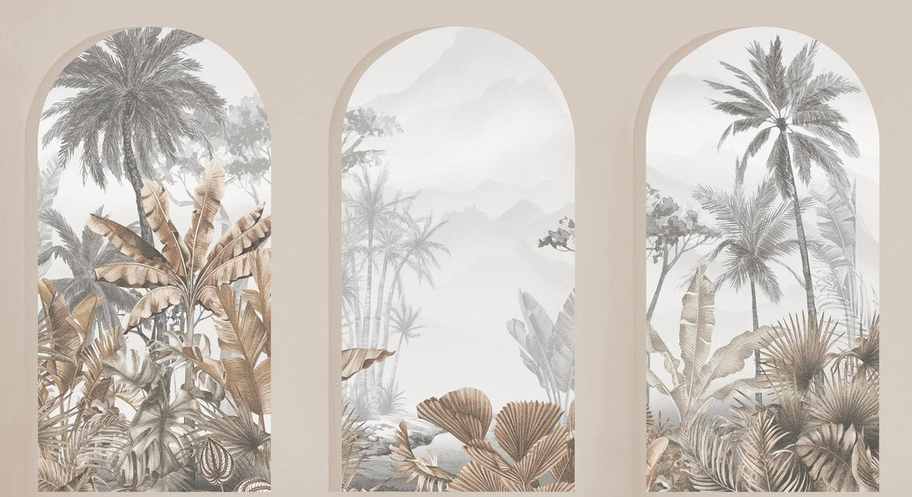 Immerse yourself in the exuberance of the tropics with our Tropical Arches Sepia wallpaper. This captivating design transports you to the heart of a lush landscape where arches enveloped in dense vegetation invite you to a spellbinding exploration within an exotic jungle. Every element of this wallpaper is meticulously crafted to create an immersive, rejuvenating ambience in your interior space.