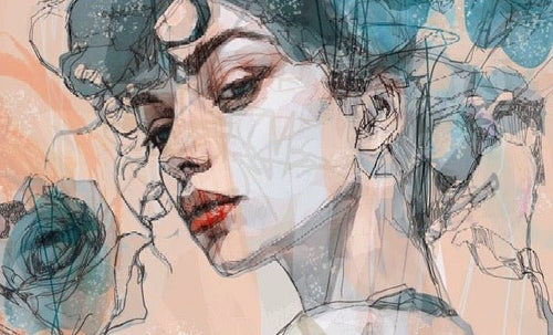 Carta da parati con volto femminile blu rosa
