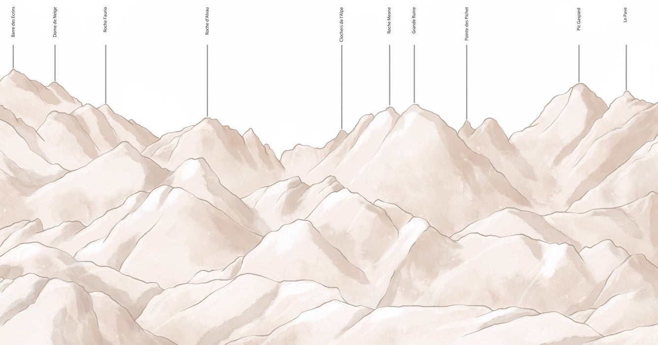 La carta da parati panoramica seppia Massif des Écrins trasformerà la vostra decorazione murale. Grazie a questa decorazione murale unica e al suo colore originale, l'atmosfera della vostra stanza si trasformerà e voi guadagnerete visivamente in altezza. Sareste il prossimo alpinista a scalare queste vette? Noi diciamo di sì!