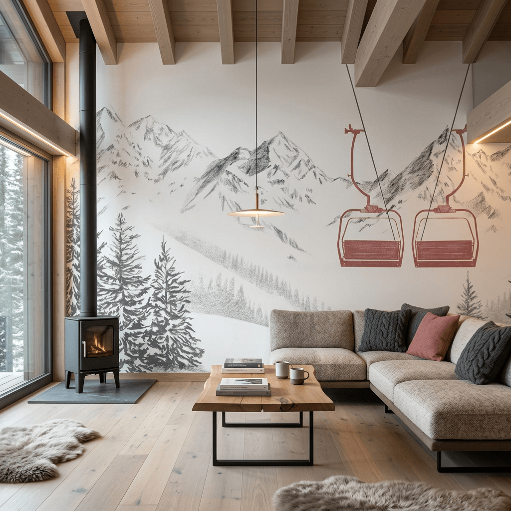Offrez à vos murs une expérience unique avec Immersion Alpine, un papier peint noir et blanc qui transforme votre intérieur en panorama grandeur nature. Sapins enneigés, cimes majestueuses et télésièges colorés en léger rouge se dessinent avec finesse pour recréer l’ambiance authentique des stations alpines.