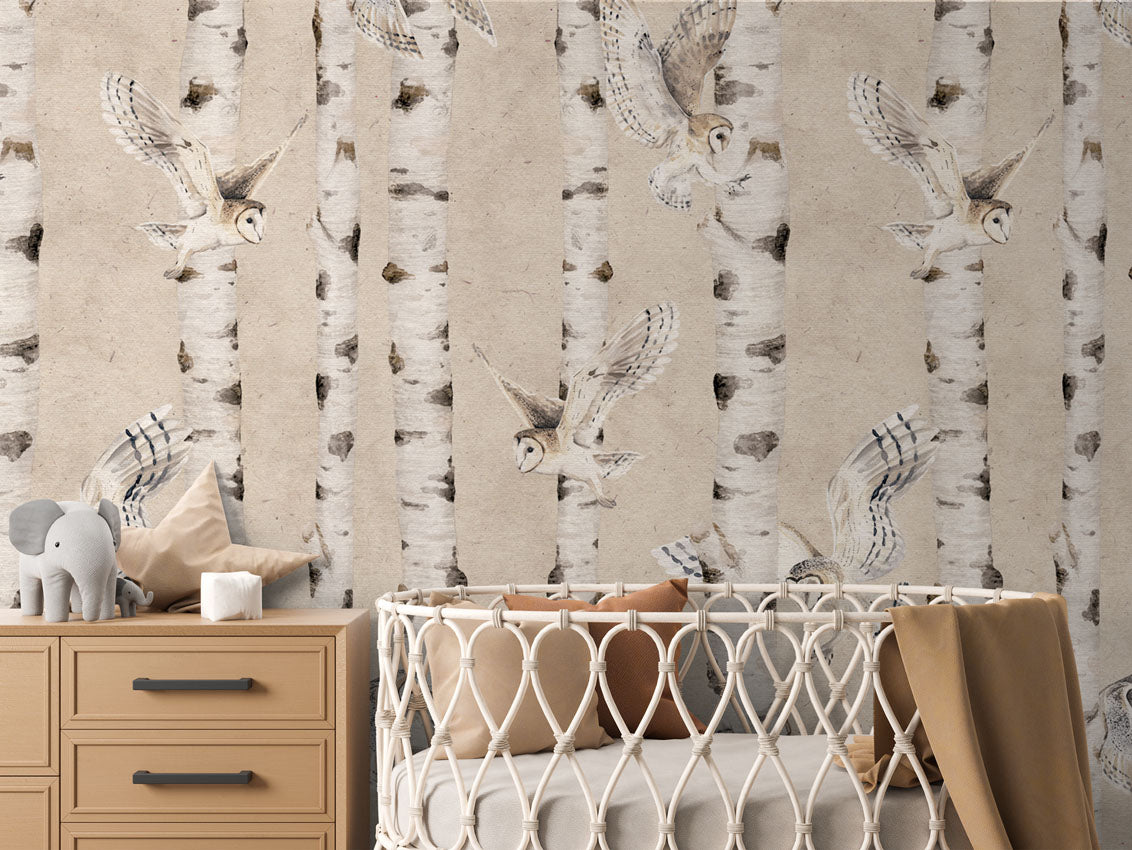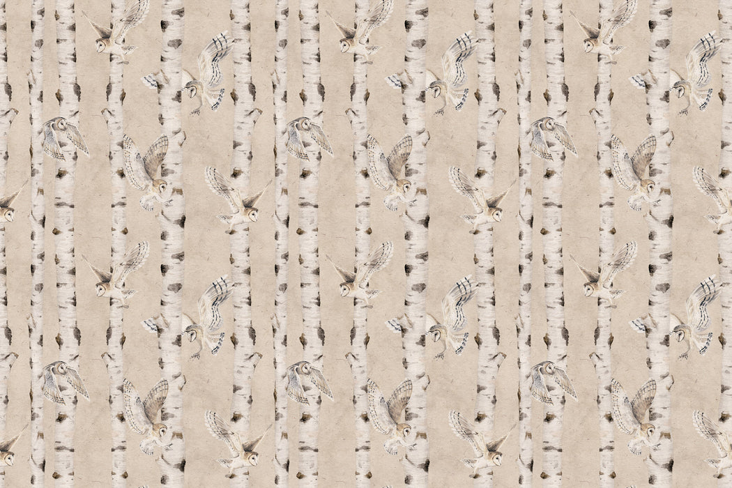 Apportez douceur et poésie à votre intérieur avec cette tapisserie sur mesure, au motif délicat de chouettes et de bouleaux.
