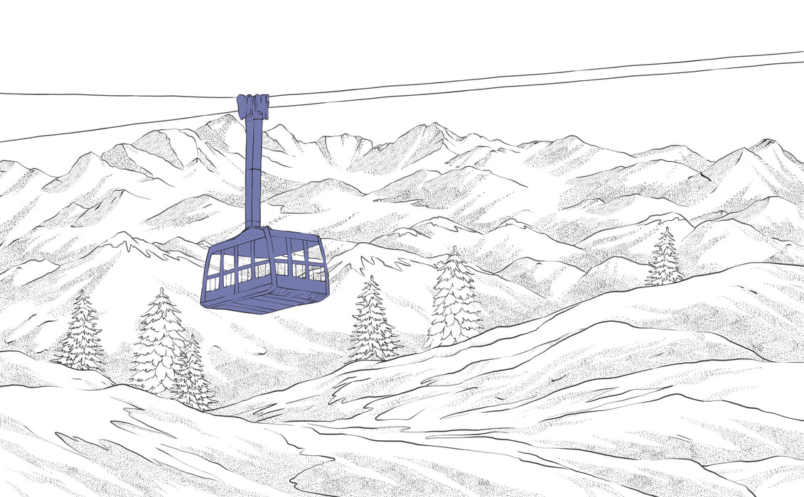 Questo disegno da parete prevalentemente in bianco e nero, con una gondola blu, presenta montagne, neve, abeti e una splendida gondola. Guadagnate altezza con la vostra nuova carta da parati su misura. Scegliete una decorazione originale con un elemento decorativo blu.