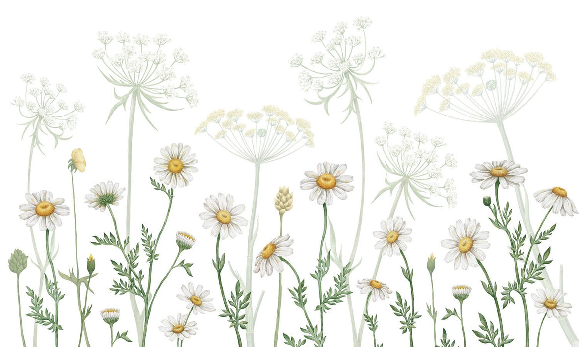 La nostra carta da parati panoramica è stata progettata per integrarsi armoniosamente con l'arredamento. Le leggere e graziose margherite creano un punto focale rilassante, ideale per camere da letto, aree relax o angoli lettura.