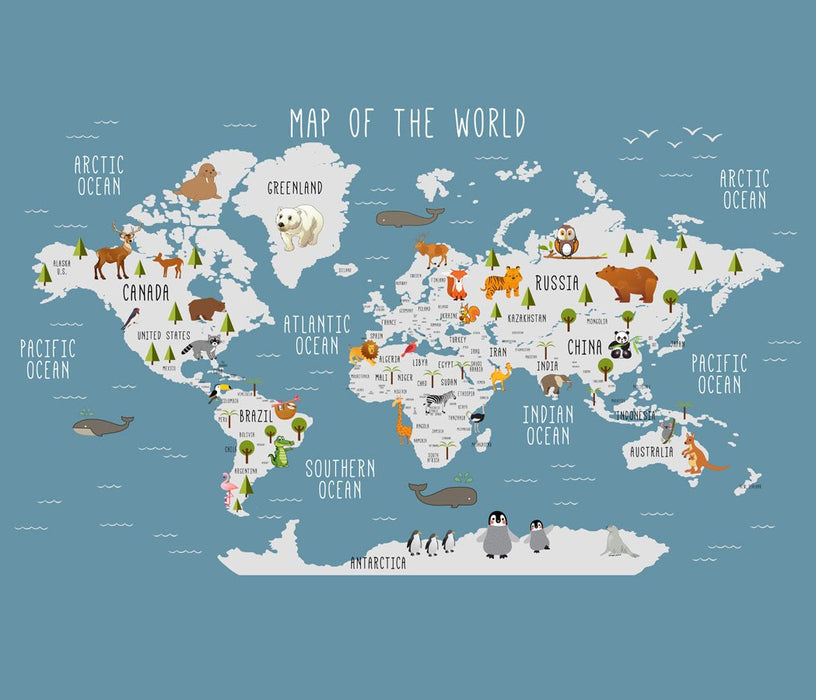 Questa carta da parati con mappa del mondo illustrata Animals blu scuro è perfetta per decorare in modo giocoso la cameretta di un bambino. I colori pastello e gli animali del mondo conferiranno uno stile morbido e un'atmosfera favorevole al relax. Un superbo insieme visivo per affascinare e divertire i bambini. È facile creare un arredamento giocoso e infantile con questa carta da parati personalizzata! La vostra decorazione murale è stampata su una carta da parati impermeabile con effetto tessuto lucido e setoso.