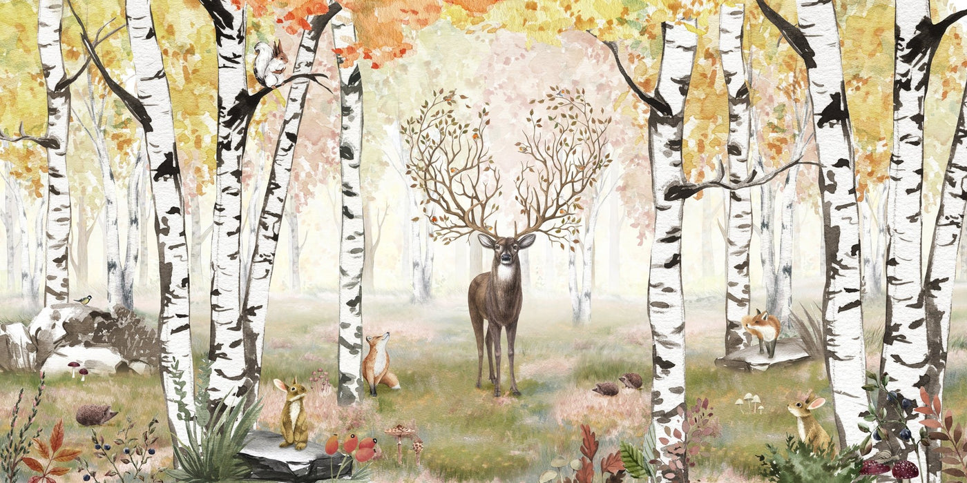 Con la carta da parati per bambini Foresta magica, immergetevi in un mondo fiabesco progettato e pensato appositamente per riempire di meraviglia le camerette di neonati e bambini. Questa rappresentazione astratta di una foresta ammaliante conquista i cuori con esili betulle, fiori luminosi e adorabili animali selvatici, tra cui conigli, uccellini e una curiosa volpe. Al centro di questa scena incantevole, un magnifico cervo con corna fiorite regna sovrano.