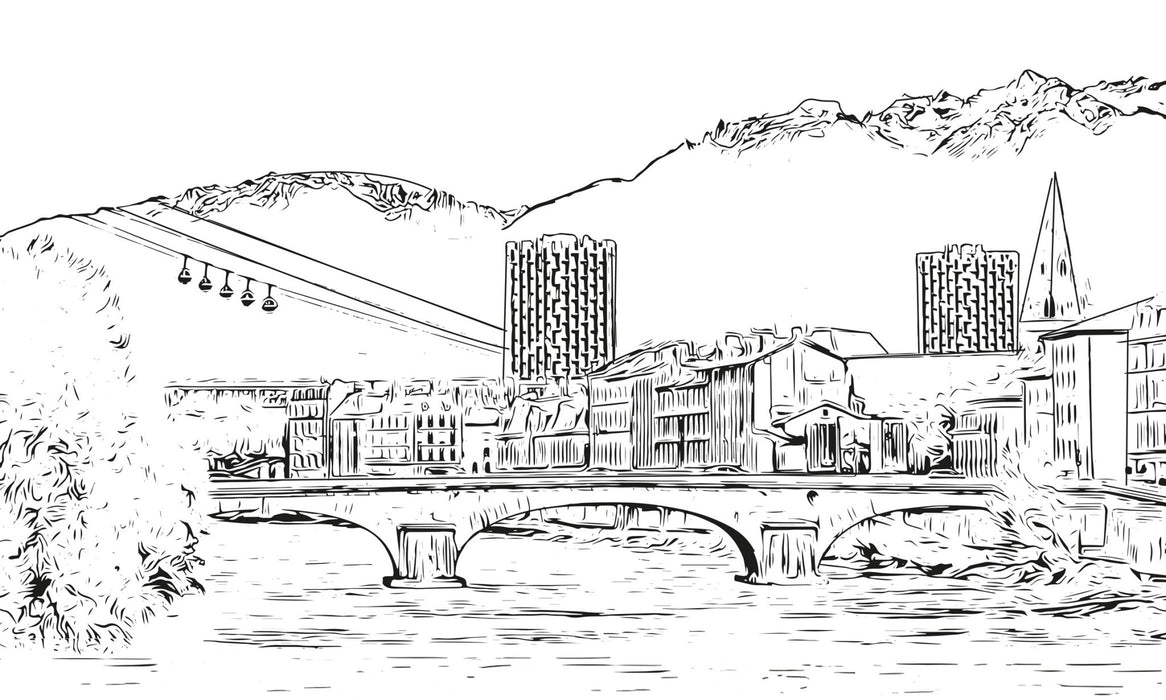 Questa carta da parati illustrata in bianco e nero raffigura una vista emblematica di Grenoble, una città incastonata nel cuore delle Alpi francesi. Si distinguono diversi elementi caratteristici: