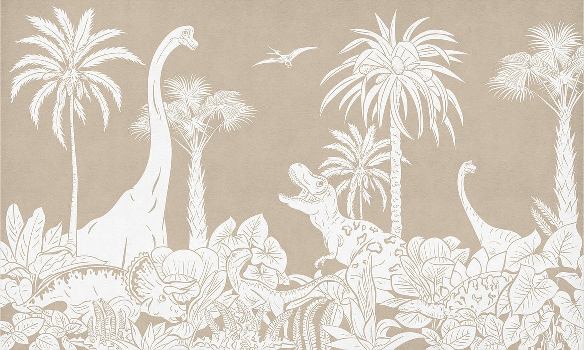Decorate la cameretta del vostro bambino con la nostra carta da parati monocromatica beige con dinosauri! Questa carta da parati illustrata con dinosauri è stata progettata per le camerette dei bambini. Questo murale di dinosauri è perfetto: crea un'atmosfera rilassante grazie al suo morbido colore beige monocromatico pastello. Con i suoi motivi di dinosauri, questa carta da parati panoramica per bambini porta un tocco di avventura. Una carta da parati mista che ci piace molto.