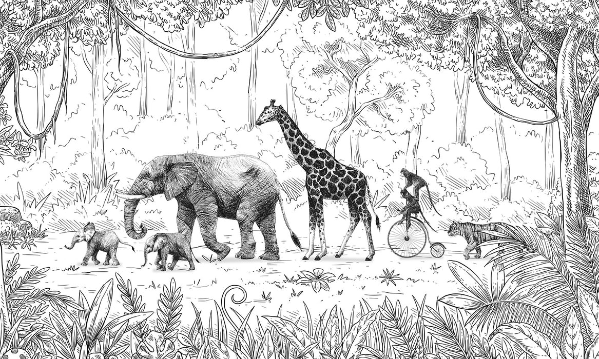 La carta da parati monocromatica in bianco e nero per bambini è la carta da parati ideale per decorare con gusto e personalità la cameretta del vostro bambino. Questa carta da parati è disponibile anche in color seppia, per una decorazione più calda. Questa carta da parati panoramica per bambini con giungla è realizzata su misura, per un risultato straordinario e sublime. Un affresco murale della giungla per bambini che raffigura gli animali della savana, per raccontare al vostro bambino storie bellissime.