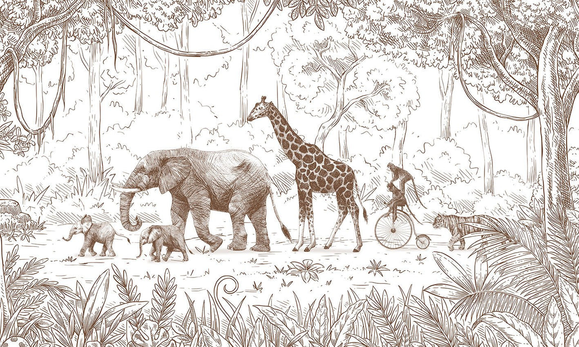 La carta da parati monocromatica giungla per bambini in color seppia è la carta da parati ideale per decorare con gusto e personalizzazione la cameretta del vostro bambino. Questa carta da parati panoramica per bambini nella giungla è realizzata su misura, per un risultato straordinario e sublime. Un affresco murale per bambini che raffigura gli animali della savana: elefanti e giraffe per raccontare al bambino storie bellissime.
