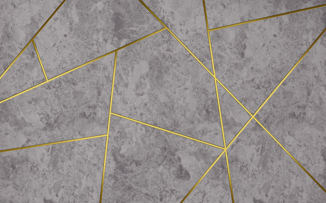 Questa carta da parati presenta un effetto trompe l'oeil testurizzato, con un effetto marmo grigio cemento, accompagnato da linee effetto oro. Questa carta da parati non contiene inchiostro dorato, ma una miscela di tonalità gialle, arancioni e marroni che le conferiscono questo effetto.