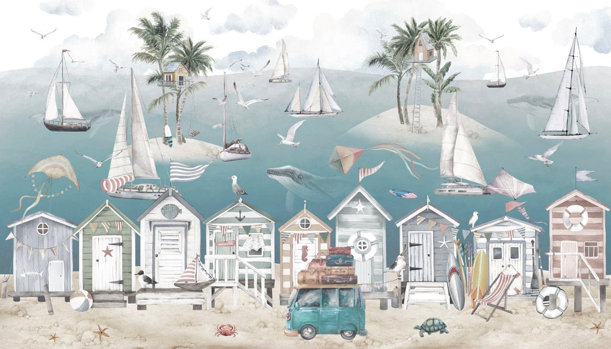 Pensata sia per i più piccoli che per i più grandi, questa carta da parati color blu pastello crea un'atmosfera dolce e rilassante. Le sue sfumature sabbia, conchiglia e cielo estivo si integrano perfettamente con una decorazione della camera dei bambini a tema marino o mare.