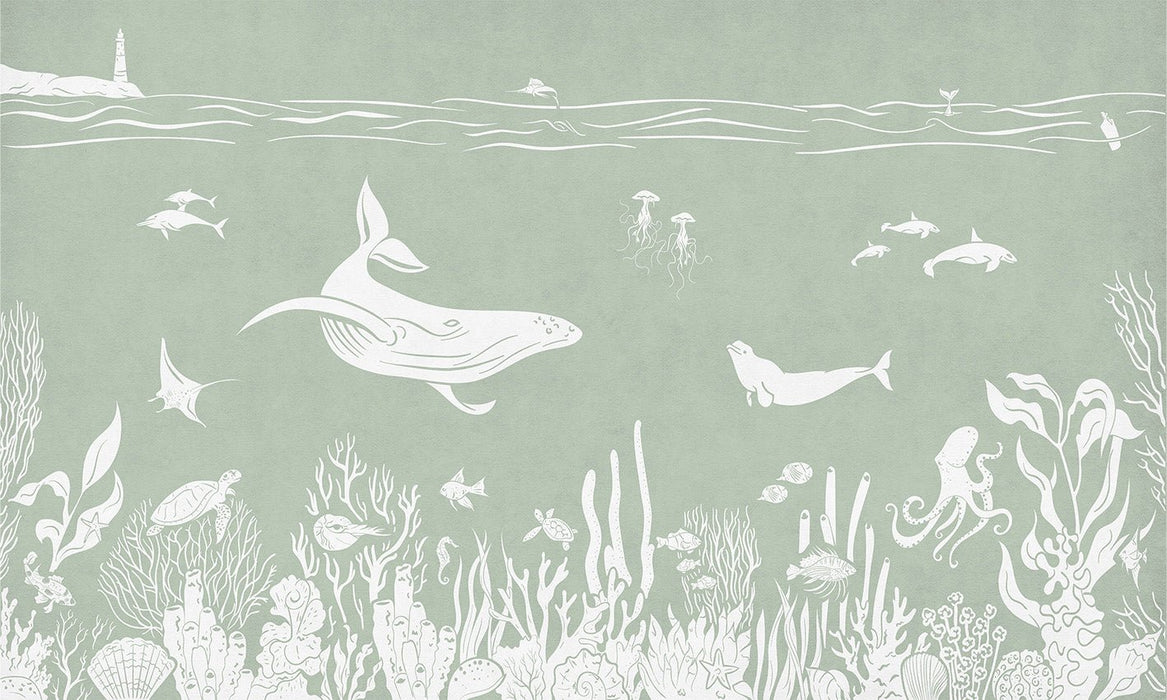 La cameretta del vostro bambino o della vostra bambina si trasformerà grazie alla nostra carta da parati verde acquatico. Questa carta da parati monocromatica verde pastello addolcisce e rasserena l'atmosfera della cameretta del bambino. Ideale per sostenere e sviluppare la curiosità del bambino, questa carta da parati per bambini con animali marini racconta storie tenere. Immergiamoci insieme tra delfini, balene, pesci e coralli per stupirci e imparare divertendoci. Il verde di questa carta da parati è tenue.