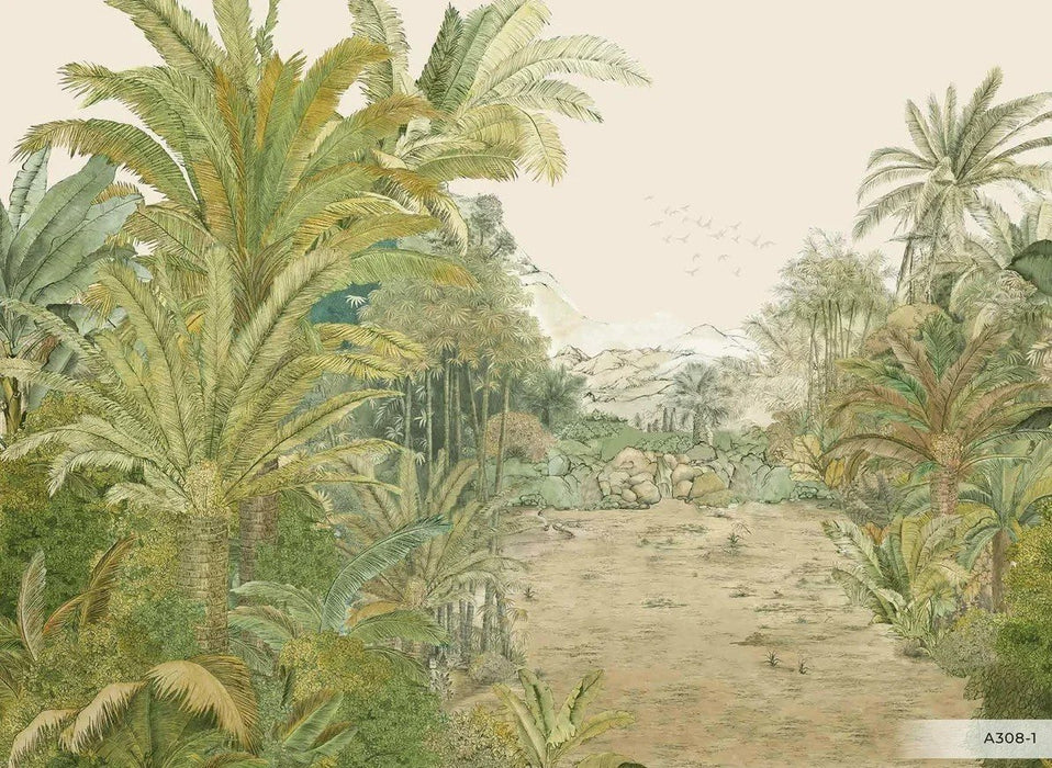 Immergetevi in un mondo affascinante con la nostra carta da parati verde paradiso esotico. Questo affresco murale dai motivi eccezionali trasformerà i vostri interni rendendoli sublimi. Date alla vostra casa un tocco raffinato grazie a questa carta da parati panoramica dai motivi meravigliosi! Banani, palme, natura... Una creazione murale che stupirà i vostri amici. sogni.