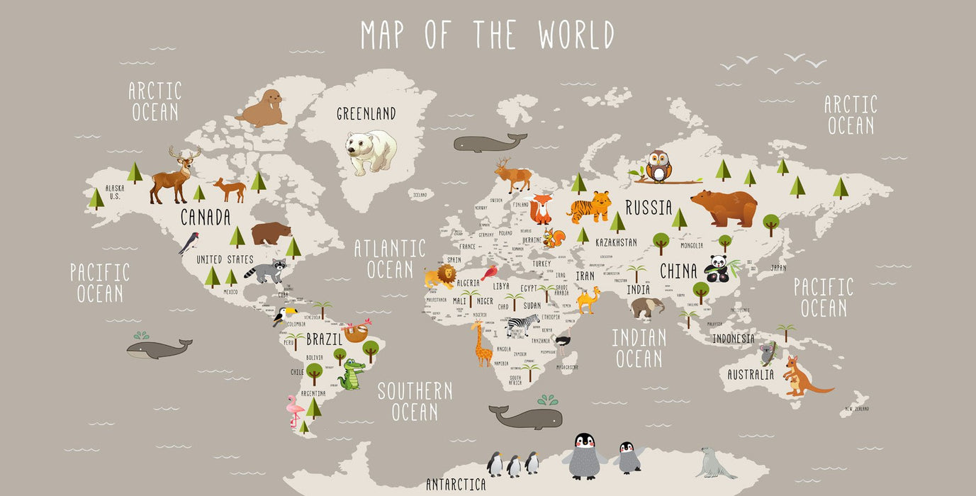 Questa carta da parati con mappa del mondo illustrata Animals taupe è perfetta per decorare in modo giocoso la cameretta di un bambino. I colori pastello e gli animali del mondo conferiranno uno stile morbido e un'atmosfera favorevole al relax. Un superbo insieme visivo per affascinare e divertire i bambini. È facile creare un arredamento giocoso e infantile con questa carta da parati personalizzata! La vostra decorazione murale è stampata su una carta da parati impermeabile con effetto tessuto lucido e setoso.