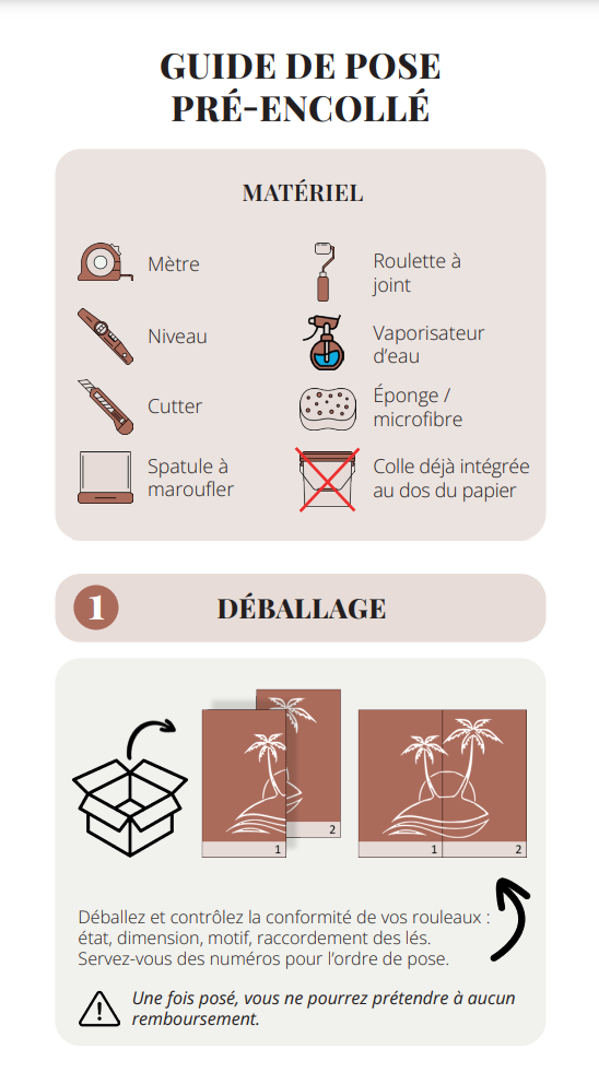 Avete ordinato una carta da parati panoramica su misura stampata su un supporto in tessuto non tessuto SOFT TOUCH o VINYLE PRO. Fate clic sull'immagine per scaricare la guida all'installazione che vi aiuterà a montare la vostra nuova carta da parati.