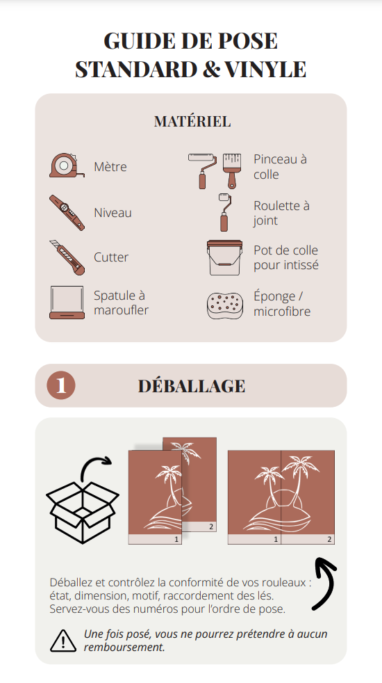 Prima di installare la vostra carta da parati, consultate la guida relativa alla vostra scelta per garantire un'installazione facile e di successo. Le nostre tre finiture sono realizzate su un supporto in tessuto non tessuto di qualità per soddisfare le vostre esigenze. Si prega di notare che le nostre guide non si applicano ad altre marche di carta da parati.